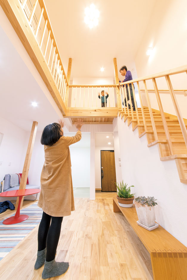 ファーストプランで決定した住まいは、吹抜けのリビングを中心に、常に子どもの気配を感じるオープンな間取りが特徴です。